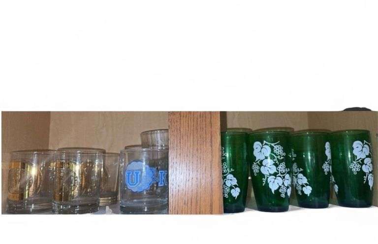 Set of 4 vintage Anchor Hocking Fire King forest green grapes and leaves, set of 4 Honorable Order of Kentucky Colonels lowball glasses, 1 UK lowball glass and assorted clear drinking glasses.