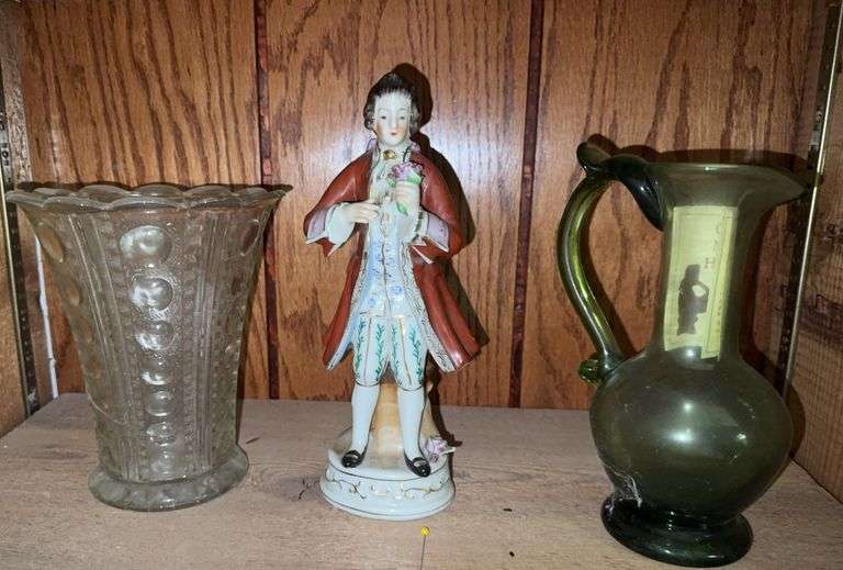 Hand blown green glass pitcher vase- paperwork inside says made in Colonial Jamestown. Also includes glass vase and Occupied Japan Orion Man figurine.