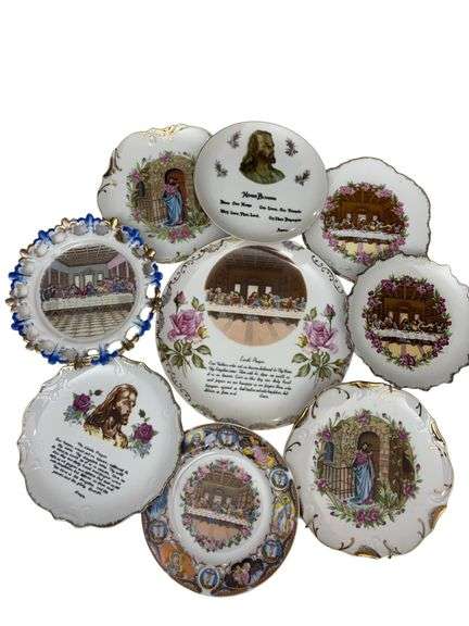Nine spiritual plates with gold embellishment. No visible chips or cracks.