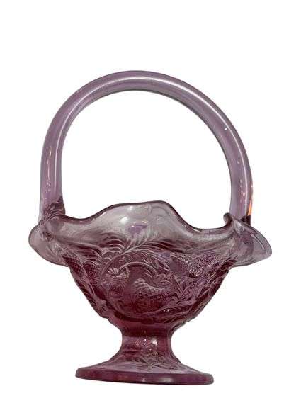 Lavender strawberry design basket. Small chip on foot. Sticker present.