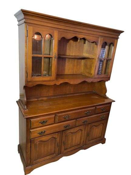 Two upper glass doors with shelves, open middle section with shelf. Lower portion consists of five drawers with brass hardware and three lower cupboard doors for storage. Unit is two pieces. Located on first floor.