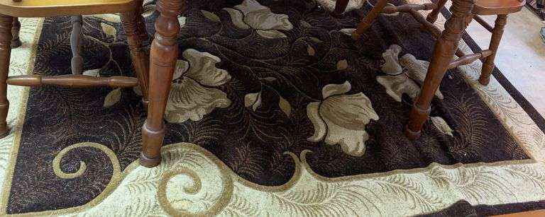Dark brown and beige floral rug. Needs to be cleaned. Located on first floor.