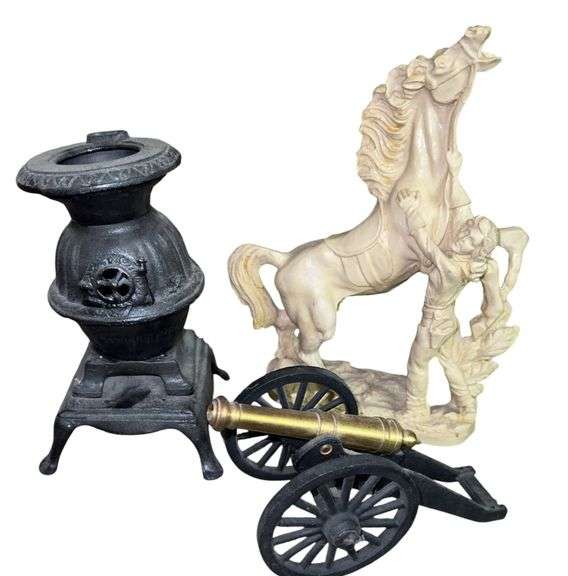 Cast iron potbelly stove and cannon. Also, includes resin statue of horse with handler.