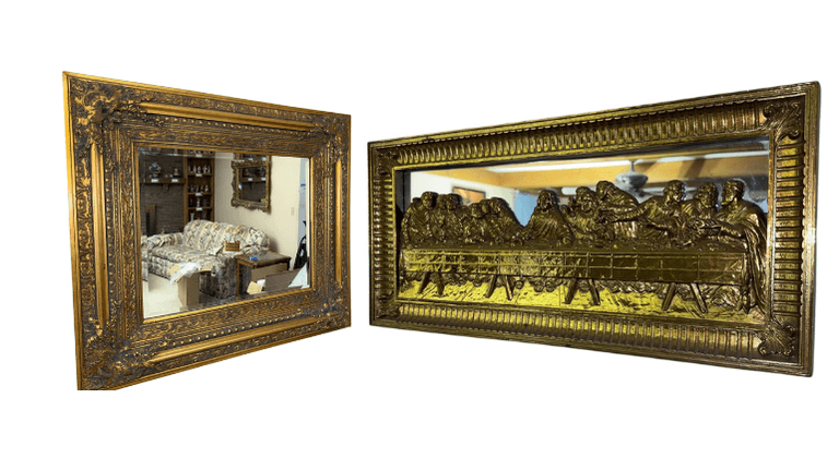 Ornate wall mirror painted in brass color, minor chipping present to edges of frame. Also includes resin like wall decor of The Last Supper with mirror in background.