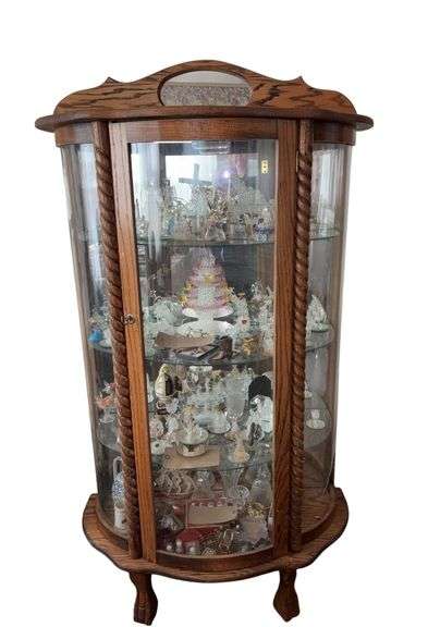 Solid wood, single door with lock and key, rounded glass. Glass on the right side is broken. Three glass shelves with lighting and upper mirror. Located in sunroom on the first floor, but there is a step. Contents not included. Pick up last day of pick up