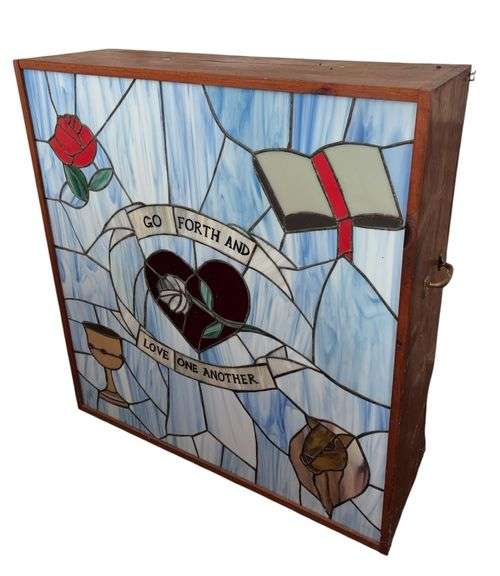 Solid wood with stained glass, Go Forth and Love One Another, handles on the side, back opens to light. Located in sunroom on first floor, but there is a step in and out.