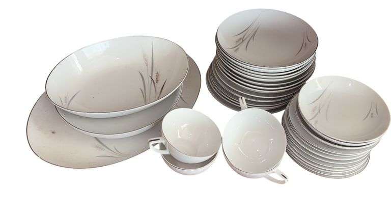 Consisting of platter, two serving bowls, 4 cups, nine saucers, three small bowls, eight soup bowls, and six side plates. Chips present.