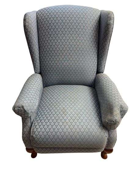 Blue patterned upholstered Queen Anne style armchair with wooden legs. Some staining present. Located on first floor.