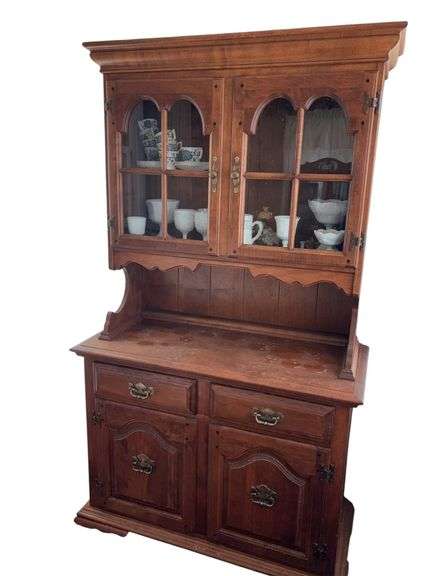 Upper portion consists of two glass doors which shelves, bottom section consists of two drawers and two cabinet doors that open to additional storage. Two pieces. Located in sunroom with one stair. Needs to be cleaned. Contents NOT included. Pickup last day of pickup.