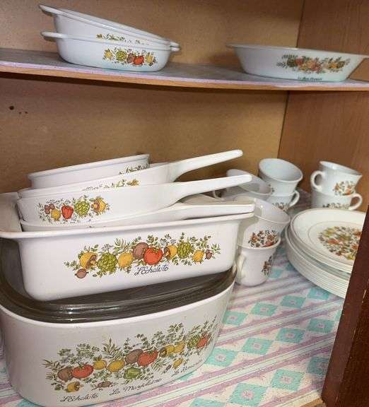 Includes large baker with glass lid, square baking dish, 3 small, handled bakers, small oval and oval divided dish and 1 handled bowl. Also includes set of Corelle Indian Summer pattern dishes- 9 dinner plates, 4 salad plates, 8 mugs and 1 divided dish. Chips present on couple of dinner plates.