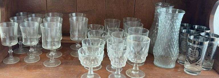 Three sets of glasses including five 25th anniversary glasses, two vases and more.