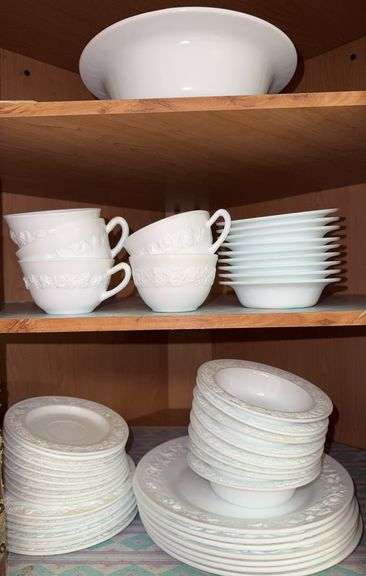Believed to be Anchor Hocking Vitrock opaque milk glass that has embossed floral pattern. Set includes 7 dinner plates, 6 dessert plates, 9 saucers, 8 bowls, 9 small bowls, 1 large serving bowl and 5 teacups. Some discoloration present.