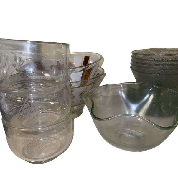 Vintage Anchor Hocking chip and dip bowls with gold leaf, set of 3 glass bowls with etched monogram, ruffle edge serving bowl, 5 vintage Indiana Glass Pineapple and Floral glass bowls and set of 13 vintage perched luncheon plates.