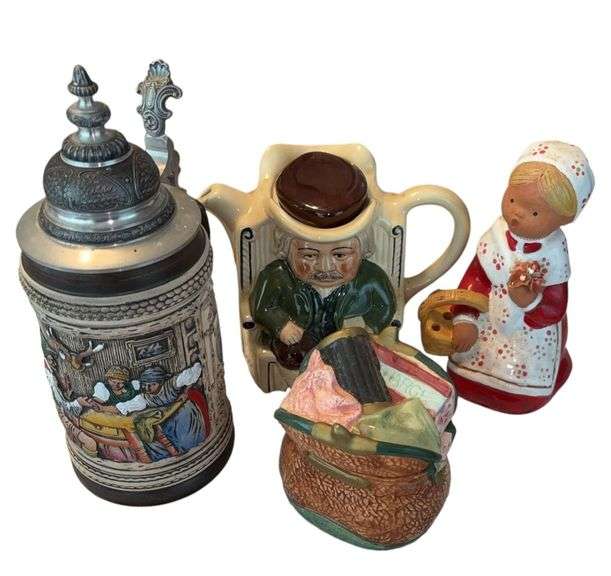 Egon Bay limited edition hand painted stein, Fitz and Floyd Omnibus trinket box, vintage Staffordshire Darby and Joan teapot. Fullar Levante figurine.