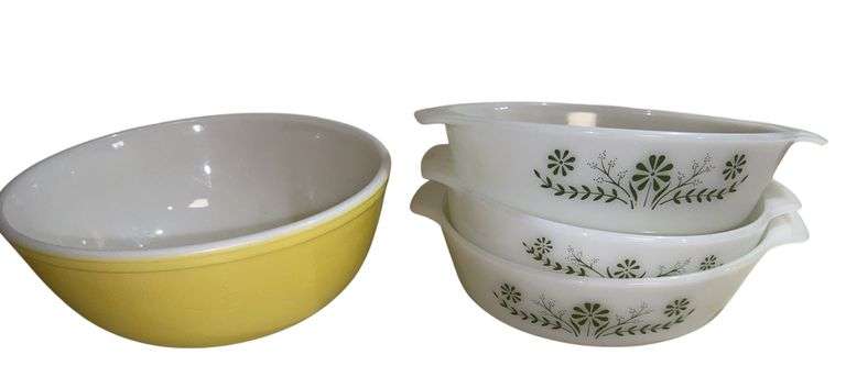 Large yellow vintage Pyrex mixing bowl and 3 vintage Glasbake casserole dishes in Green Daisy pattern by Jeannette Glass Company.