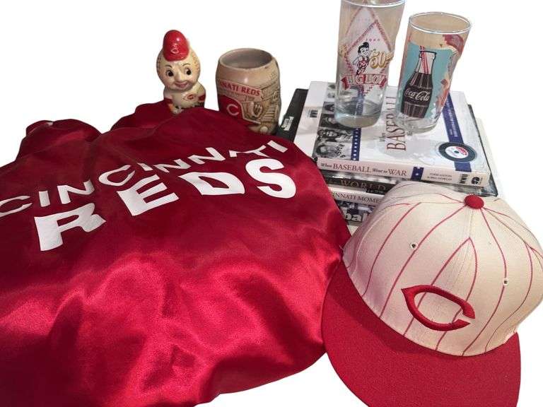 Vintage Reds jacket and ballcap, bobble head- has been cracked and repaired, Reds stein, baseball books, Big Boy and Coca-Cola vintage glasses.