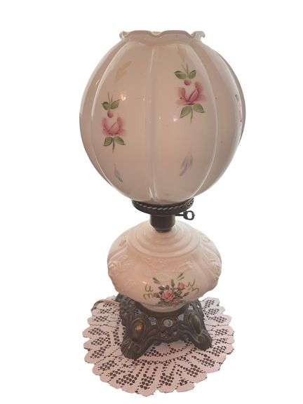 Three-way light with floral hand, painted shade and base on metal foot. Powers on.