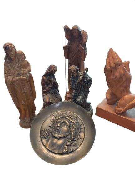 Metal decorative plate, ceramic praying, hands, Austin Sculptures, and wood figurines.