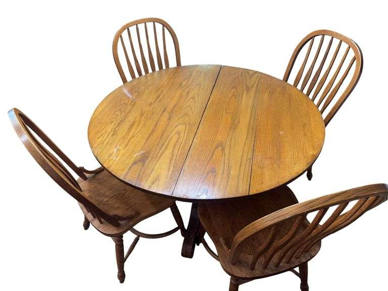 Oak pedestal dining table and 4 chairs. Some staining and scratches present. Also includes 2 leaves. Located on first floor.