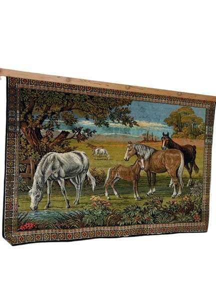 The tapestry features a pastoral scene with several horses in a landscape. Dense short weave with wood hang bar. Needs to be cleaned.