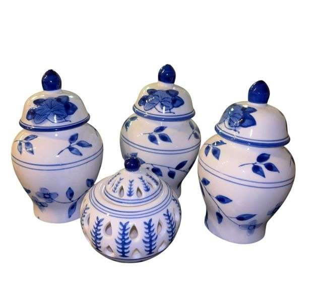 Three matching floral blue and white ginger jars with lids and a small ginger jar with cut outs and lid. No visible chips or cracks.