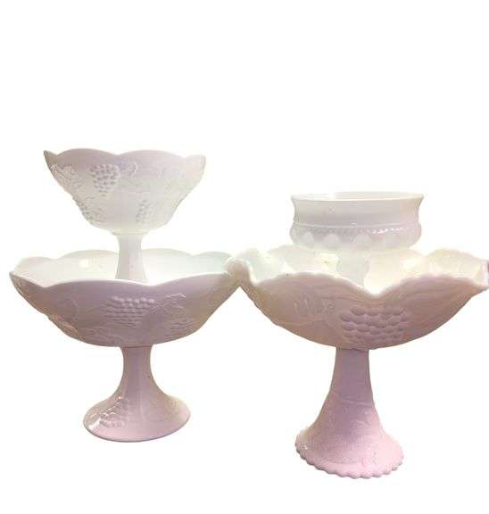 Pair of footed scalloped bowls, along with two smaller footed bowls. No visible chips.