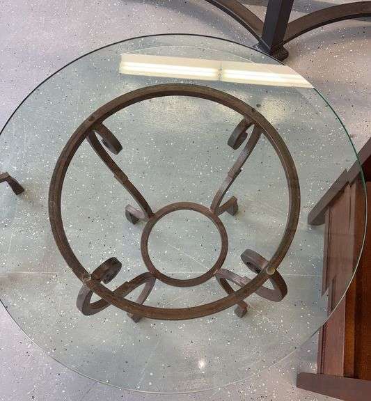 Beveled removable glass top on brown metal base.