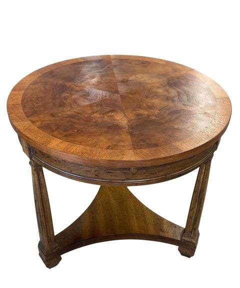 Inlaid burl wood table with lower shelf and writing slide with brass knob.