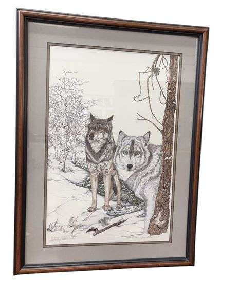 . Gray wolves. Signed lower left numbered 201/450. Matted in wood frame.