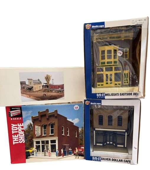 Two Built Ups buildings, Walters cornerstone series toy shop model kit, and JV models building kit. Unsure if all pieces are present