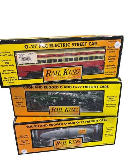Pittsburgh PCC electric streetcar, MTH service center flat car and Central of Georgia modern tank car. In original boxes.