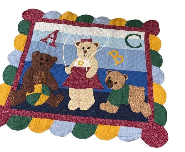 Teddy bears playing multicolored floral with scalloped edge. Stained