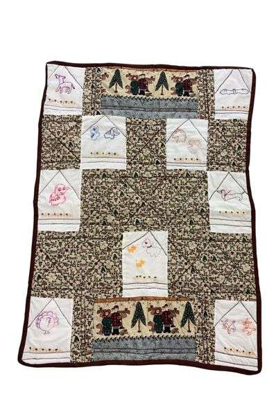 Holiday background with embroidered inserts. Backing on quilt is green with cows golfing.