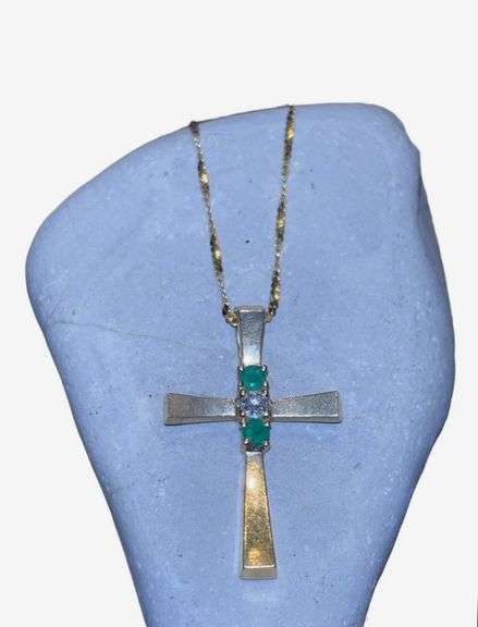 14KT cross pendant with diamond and emeralds. Marked Italy 14k