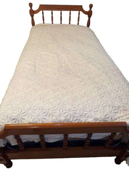 Twin size spindle bed with cream colored chenille bedspread. Mattress and box spring available at buyer’s choice. Located on second floor. Needs to be disassembled.