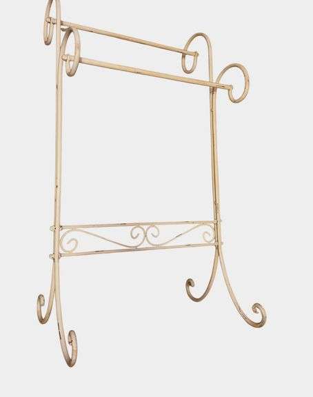 White wrought iron scrolled quilt rack. Scratching present. Located on second floor.