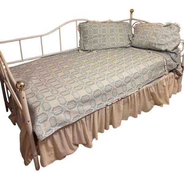 White metal with brass accents includes mattress, sheets, dust ruffle, bedspread, two pillows along with lower rolling frame and mattress. Will need to be disassembled for removal. Located on second floor.