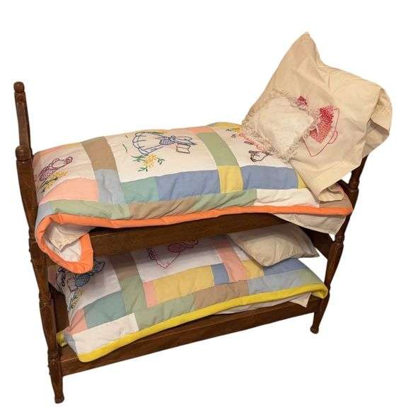 Solid wood, stacking bunkbed with matching coordinating quilts, embroidered pillowcases. Located on second floor.