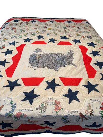 Features a central map of the USA surrounded by red, white, and blue patchwork star motifs and state squares with state birds. Backing consists of peacock design.