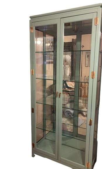 Blue/Green with two beveled glass doors, brass hardware and 4 adjustable glass shelves, mirror back and light.