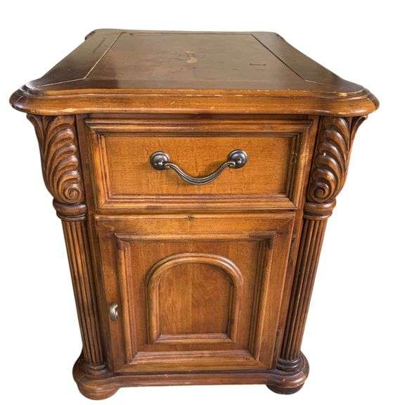 Believe to be solid wood nightstand with one drawer, brass hardware, fold out magazine storage and lower cabinet. Carved wood detail. Damage on top along with scratching. Located in garage.