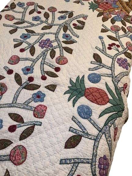Floral and pineapple appliqué quilt on white background with paisley editing and blue stitching. Believed to be handmade.