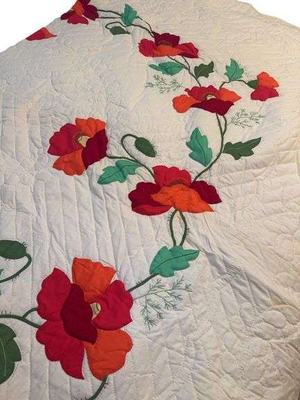 Handmade floral appliqué quilt with bright flowers on pale yellow background, yellow edging and bright yellow reverse with scalloped edge all around. Some minor staining present. Located on second floor.