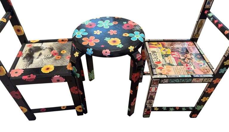 Painted and decoupaged matching table and chair set. Top rung of one chair is loose. Additional chair included.