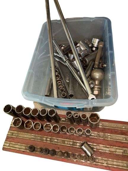 Variety of socket wrenches, ratchets, and breaker bars. Located in garage.