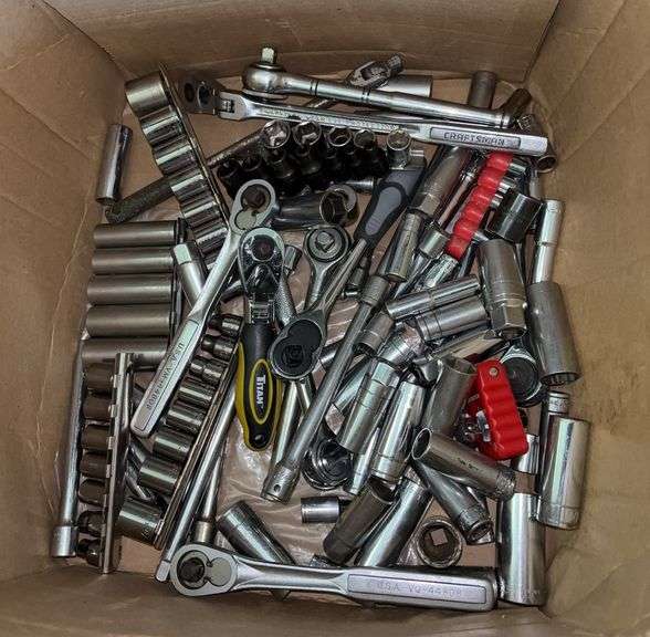 Variety of tools with socket, ratchets and wrenches. Located in garage.
