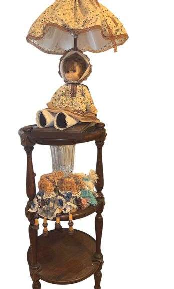 Small round accent table with 2 shelves. Also includes doll lamp, glass votive lamp with brass base and 4 button dolls.
