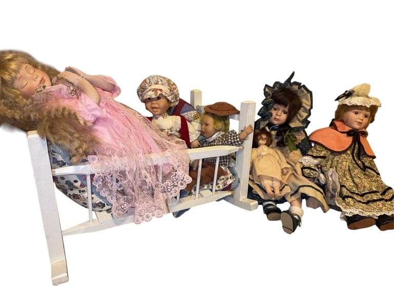 Variety of porcelain dolls. Also includes wooden baby cradle- needs repaired.