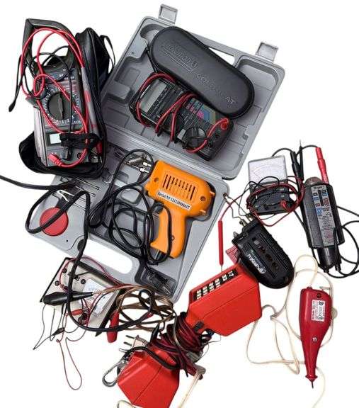 Wen electric pencil engraver model 2520. Lineman's handset, electric soldering gun, voltage tester, Micronta LCD digital multimeter.