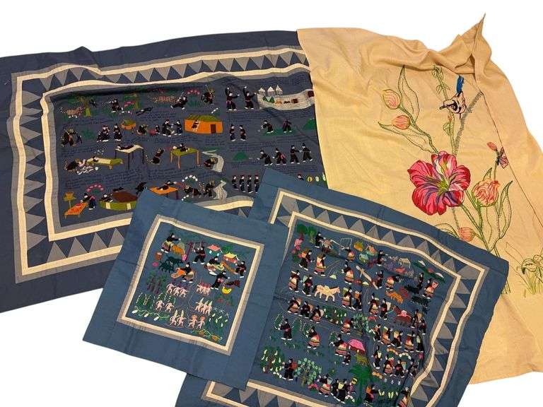 Embroidered fabrics. Blue depicts a story with words and pictures and 2 matching pieces- Stain’s present on smallest piece. Floral is on linen type fabric.